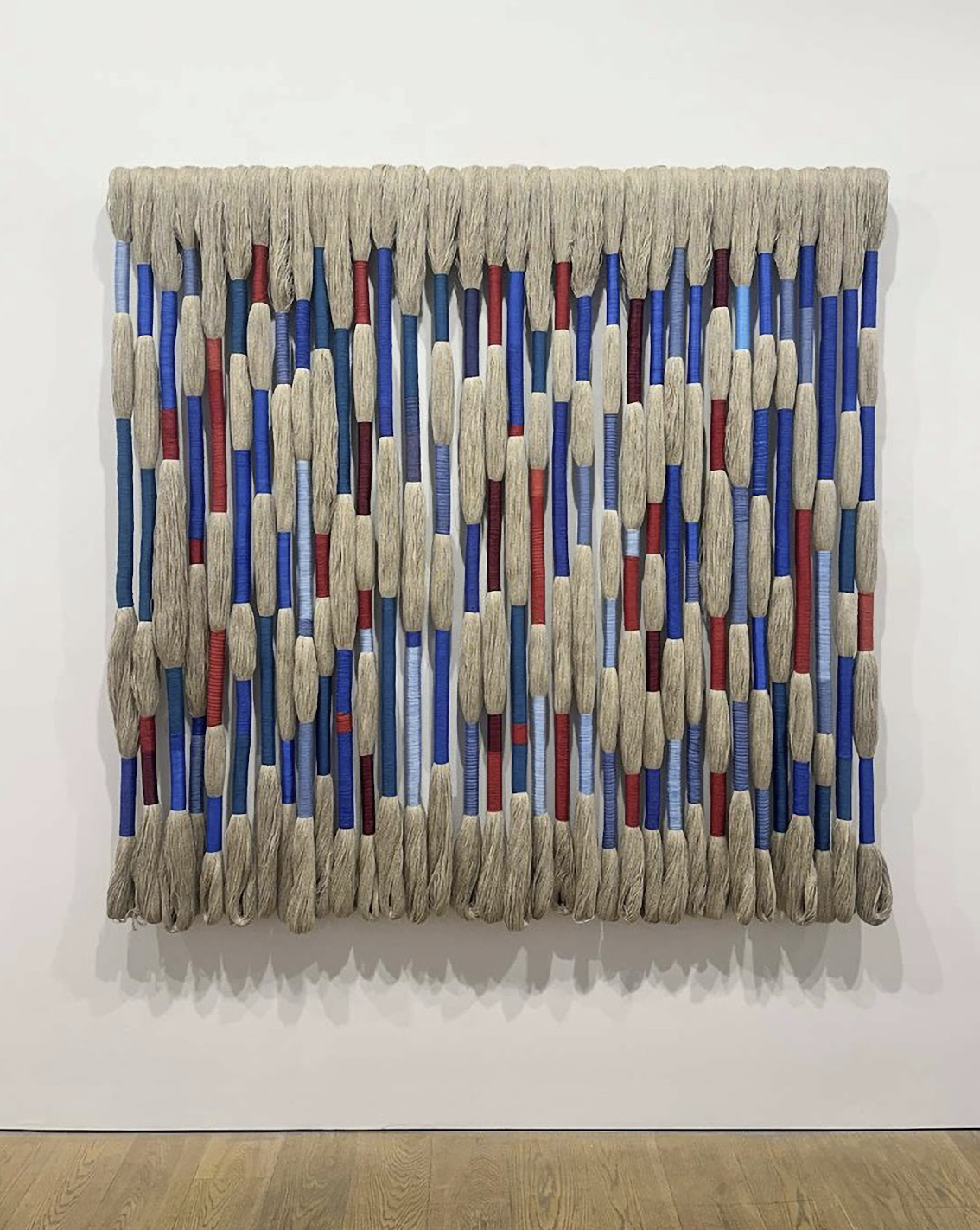 “For more than seven decades, Sheila Hicks has helped expand the material possibilities of fine art, continually redefining how textiles can communicate with the immediacy and nuance of paint on canvas. In Festive Chorus, she embraces a sense of joy - something often elusive in a world shaped by upheaval. Her methodical knotting, twisting, and wrapping honor the logic of the grid while leaving space for improvisation and play through shifting degrees of tightness and looseness. The interplay of blue, green, and red threads forms a gentle visual rhythm, creating a quiet, calming melody that settles into a harmonious equilibrium.”