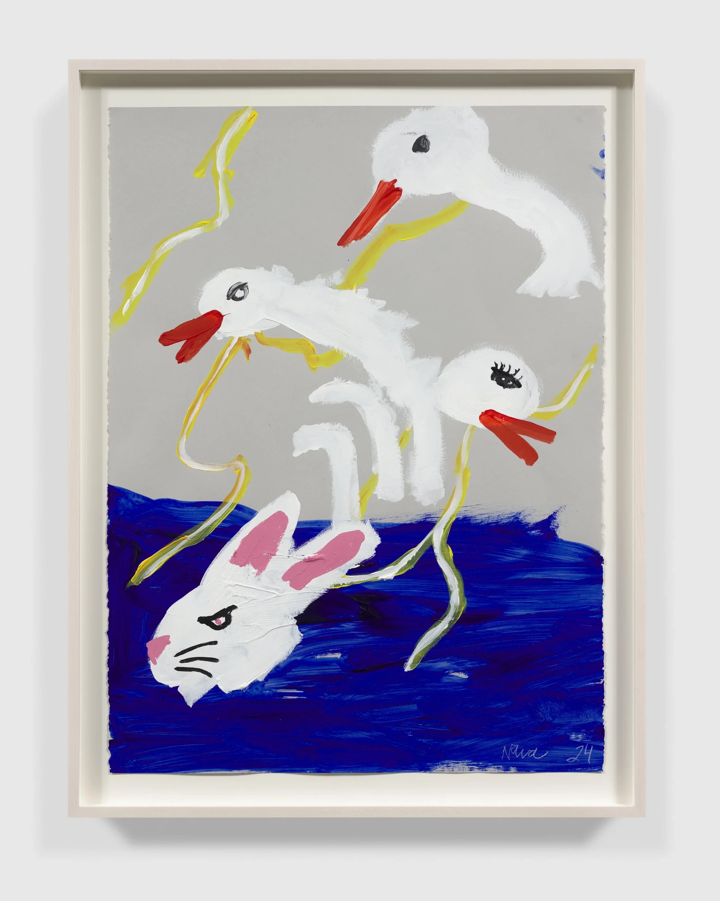 “My pick for EXPO Chicago is Robert Nava’s Small Friend Group, presented by Night Gallery. Nava’s work is a particularly apt choice for this fair, given the artist’s upbringing in Chicago. Drawing from prehistoric cave paintings, Egyptian antiquities, video games, and pop culture, he creates his own mythology within his energetic and playful compositions. Layering oil stick, graphite, acrylic, and spray paint, Nava produces imaginative, creature-filled paintings that I am always thrilled to see. The geese and the rabbit here feel very appropriate for the beginning of spring.”