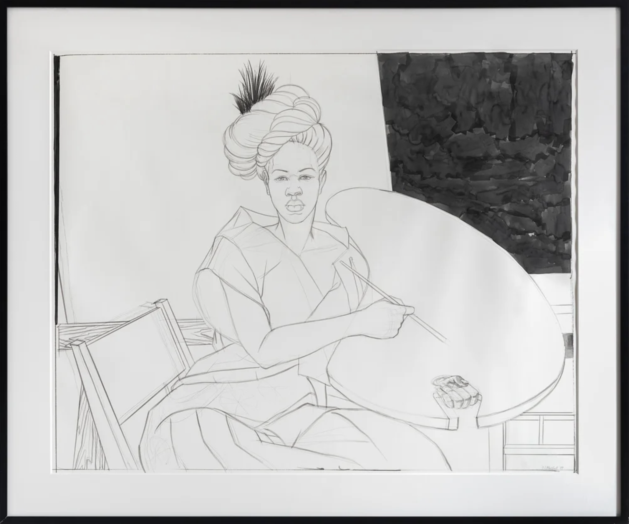 “One of the most exciting works on view at Expo Chicago is this Kerry James Marshall study for his iconic 2009 painting from the collection of the Yale University Art Gallery. Kerry James Marshall (b. 1955, Alabama) interrogates Western art history—from the Renaissance to 20th-century American abstraction—challenging and recontextualizing the canon to include themes and subjects that have historically been omitted. His artistic mastery has helped address what he calls “the lack in the image bank” by foregrounding Black figures in his paintings. In this composition, Marshall engages a long-standing art historical tradition of images about image-making, depicting a woman of color as a portrait painter—a role historically denied to both women and people of color. Her sustained, direct gaze draws the viewer into the composition, projecting confidence and asserting a challenge to entrenched, codified notions of gender, race, and identity.”