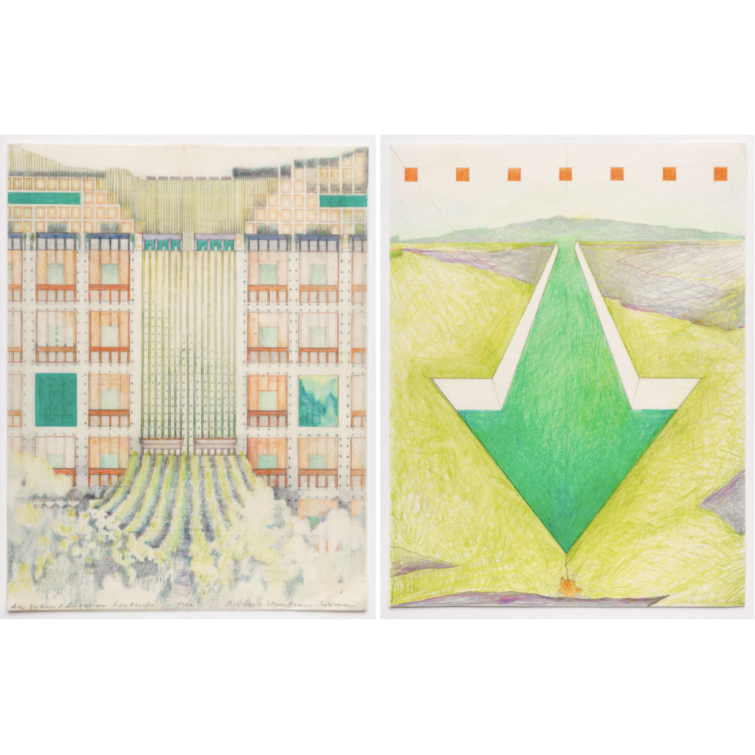 Barbara Stauffacher Solomon, An Urban / Agrarian Landscape, 1987; Untitled (Green Arrow Breaking Ground), c. 1980s. Courtesy of the Barbara Stauffacher Solomon Estate, Anthony Meier, Mill Valley.